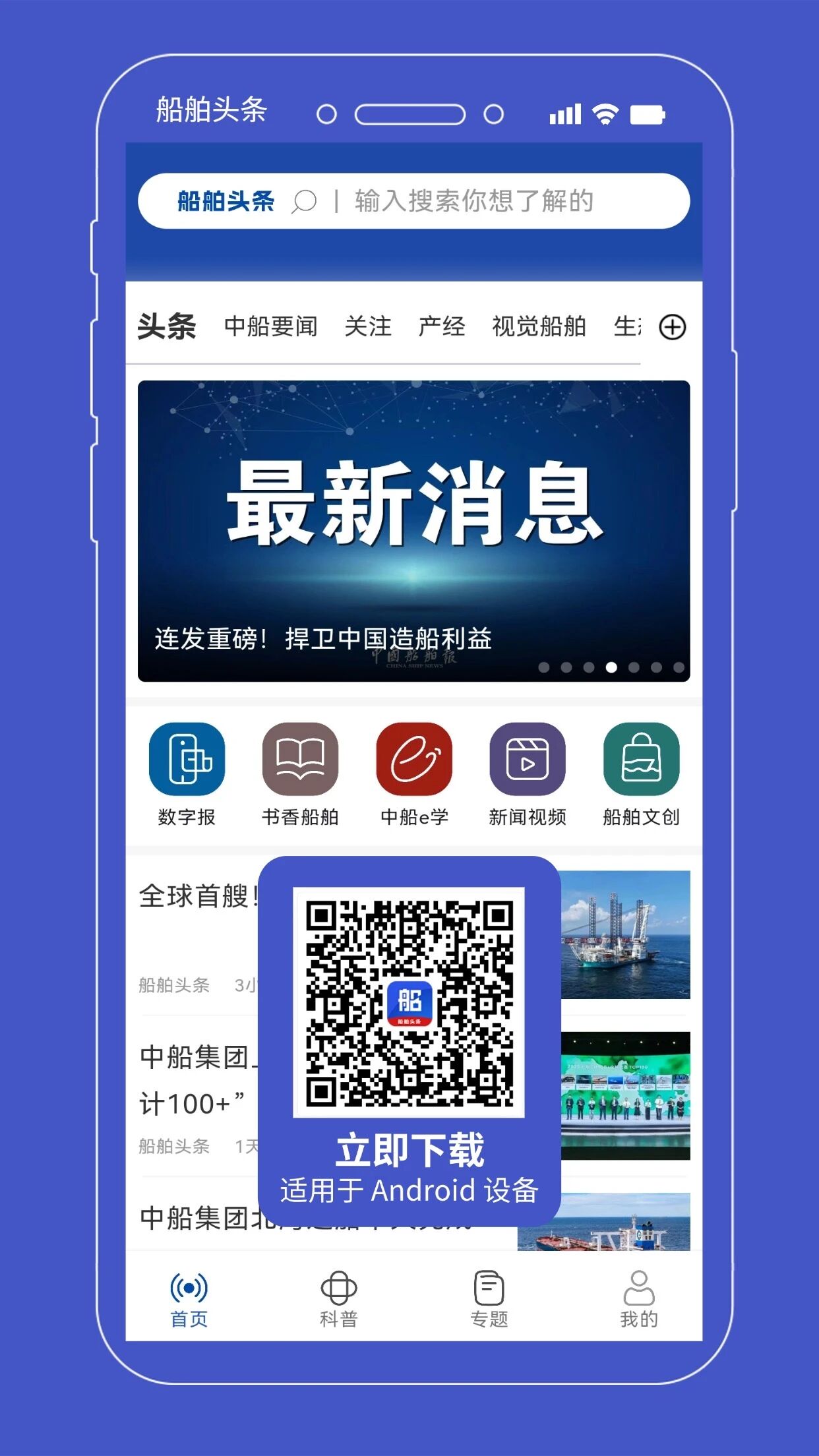 “船舶頭條”App聚焦海洋裝備產(chǎn)業(yè)鏈,集新聞發(fā)布、融合傳播、專業(yè)解讀、科普宣傳、企業(yè)智庫、服務聚合等功能為一體,設有“頭條”“中船要聞”“關注”“產(chǎn)經(jīng)”“視覺船舶”“生態(tài)圈”6個精品頻道以及“科普”“專題”等功能版塊,并鏈接“書香船舶”“《中國船舶報》數(shù)字報”“中船e學”“新聞視頻”“船舶文創(chuàng)”等多個服務端口,目前支持安卓系統(tǒng)下載使用。