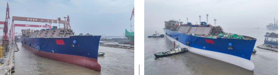 近日,在中船長興造船基地中國船舶集團旗下滬東中華2號船塢,首次呈現了4艘174000立方米大型液化天然氣(LNG)運輸船同塢建造,其中2艘同日出塢、2艘半船起浮的盛景。
